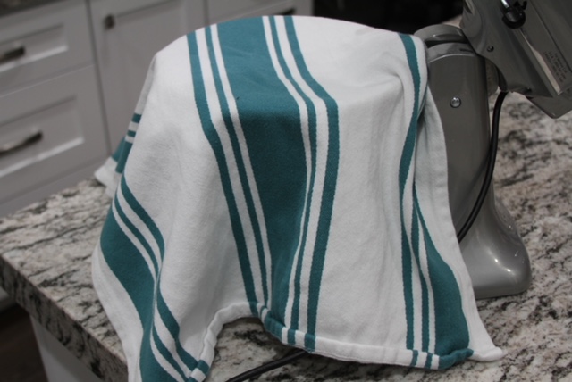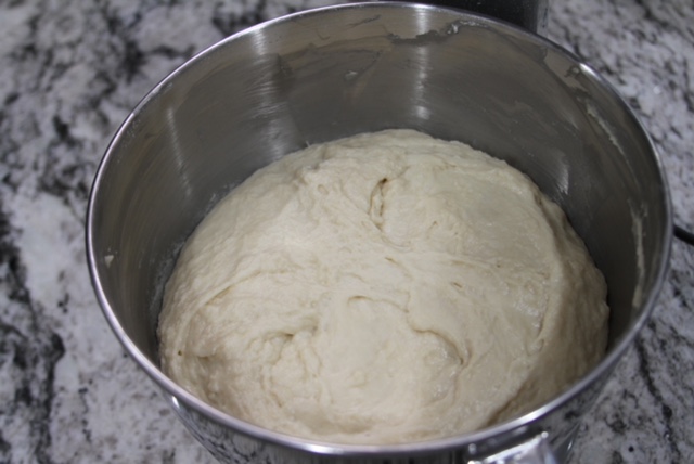 Transfer your liquids to a mixing bowl and add about 8 cups of flour, 1 tsp (heaping) baking powder, 1 tsp baking soda and 1 Tbsp (heaping) of salt. Mix until combined, this will form into a sticky dough. Cover the dough with a light towel and let it rise for about an hour.