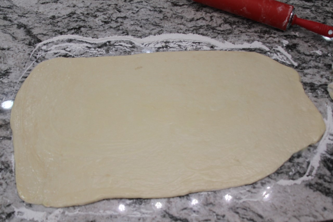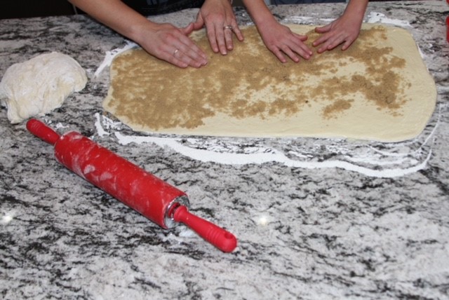 After your dough has risen, remove it from the bowl and place it onto a floured surface. Add 1 more cup of flour and knead it together. Take about 1/2 the dough and on a floured surface roll it out into an 18 X 9 inch rectangle. Cover the surface completely with a thin layer of melted butter. Sprinkle liberally (to your preference) with cinnamon and then sprinkle with 1 cup of brown sugar. Now, roll the dough tightly. You should be rolling the short side of your rectangle towards the other short side. Once you get to the end, close the roll by pinching it together. Repeat with the other half of the dough.![]()