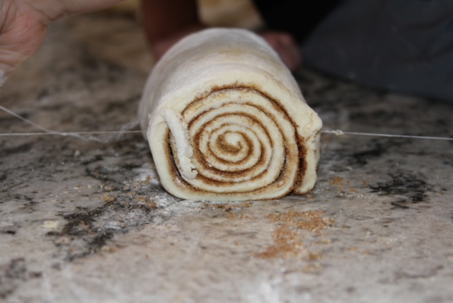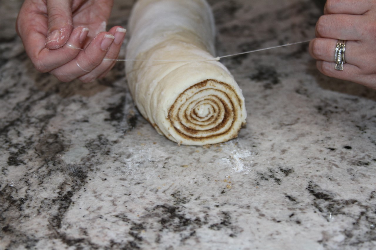 Now take some thread (or unflavored floss) and slide it under your dough roll about 2 1/2 inches inwards. Wrap the thread around the roll, cross both strings on top and Pull both strings outwards slicing the dough into individual sections.