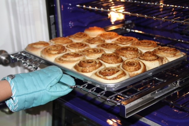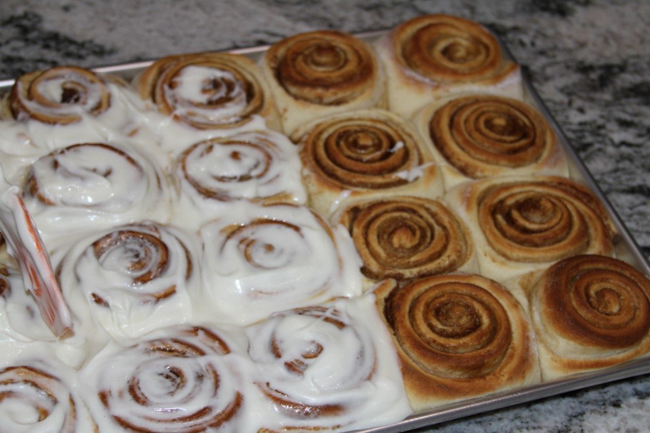 Place the rolls onto a greased pan almost touching each other. Let them rise for 20 minutes, then put them into the oven at 400 degrees for about 15 minutes. Remove and cover with frosting. Frosting: Cream together butter and cream cheese. Slowly add powdered sugar. Add milk to make preferred consistency.![]()